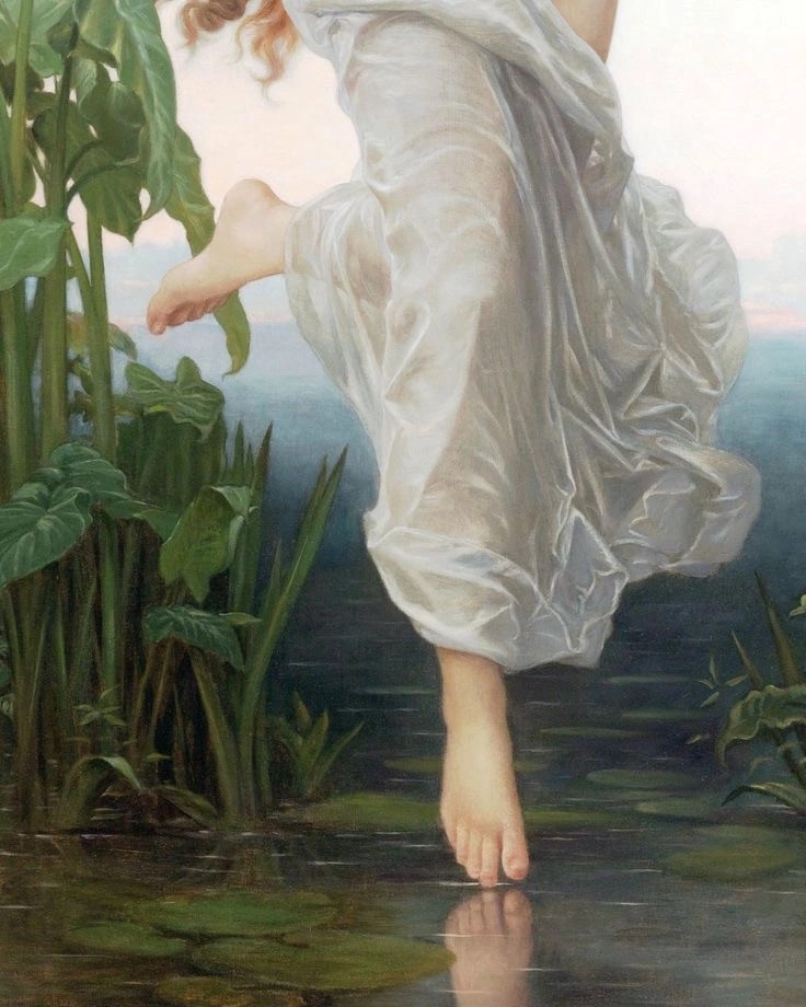 My limbs are shaking from the cold water and fear as I make my way cautiously to shore. I am uncomfortably aware of my nudity and rather unusual behavior. I’m not forbidden to be alone in the sea, but it’s not something “normal” women do. Being alone is something a crone does. I cover myself with my hands as best I can as I exit the sea. The figure doesn’t seem to be paying attention to me. It’s hunched over moving mechanically from side to side while its feet remain firmly stuck to the ground, unnervingly firm, like it has rocks in its shoes weighing it down. It moves to the beat of a silent song. A beat, which I feel in my soul, to be the song of death.
